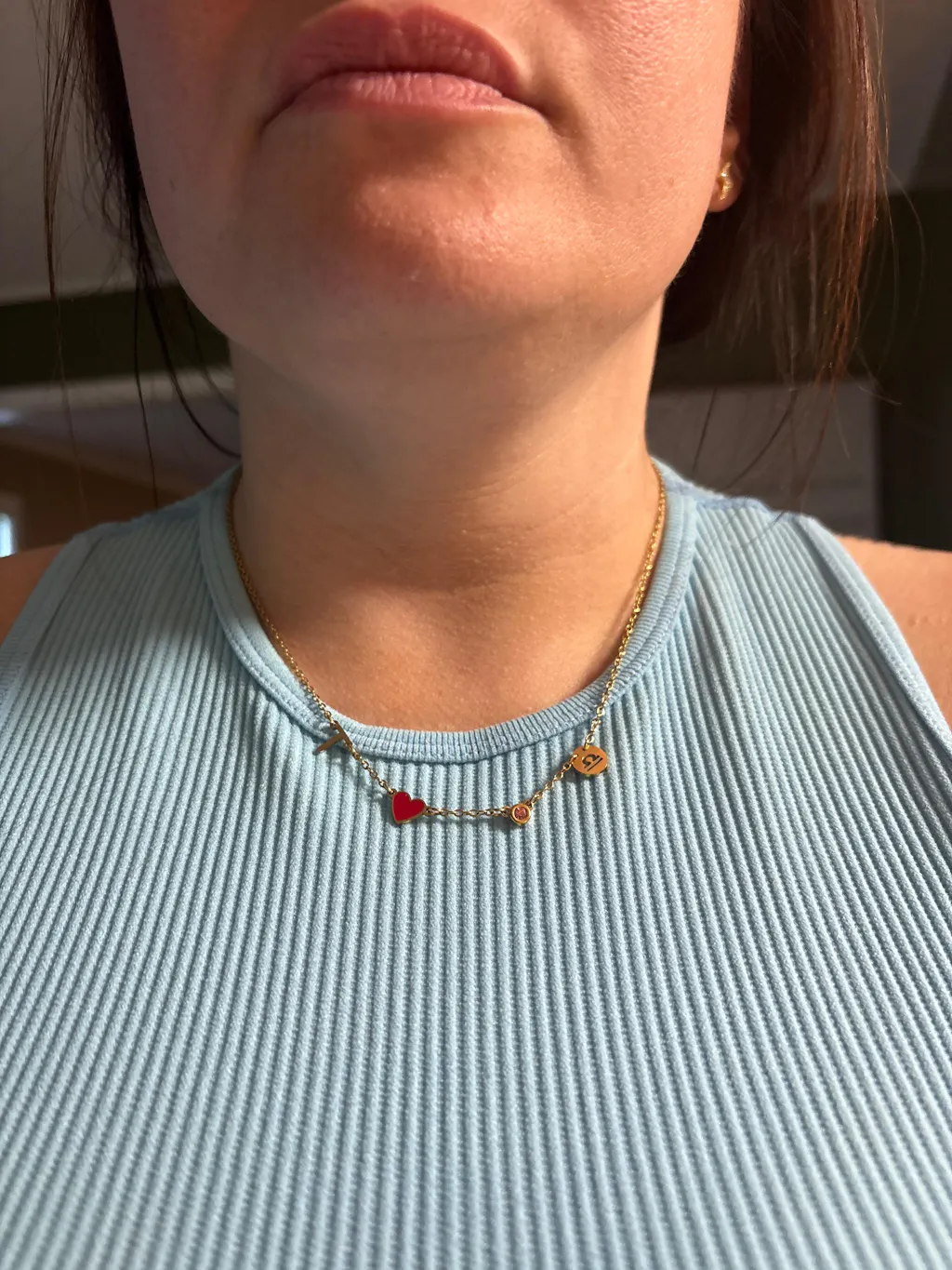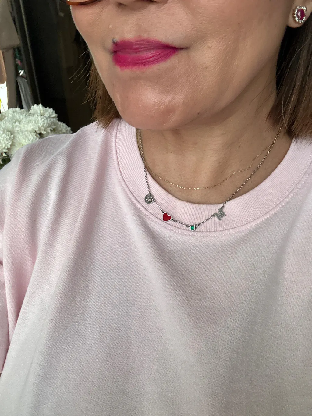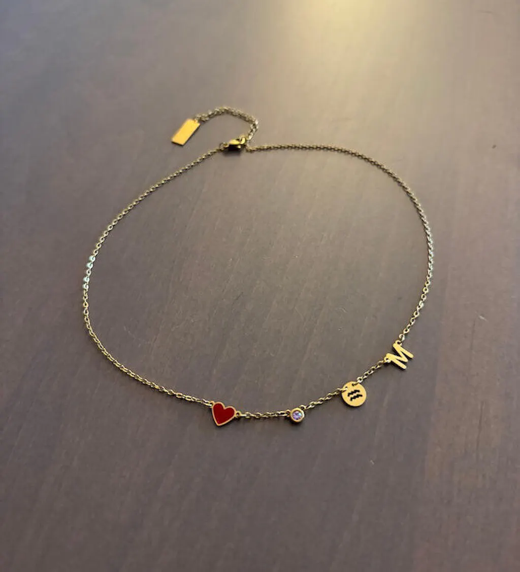 Celebrate timeless elegance with our Custom Initial Heart Necklace with Birthstone and Zodiac Sign. Designed to be both waterproof and tarnish-free, each piece is thoughtfully personalized with your chosen initial, radiant birthstone, zodiac sign, and enamel heart symbol, creating a deeply meaningful keepsake that embodies your unique story with enduring beauty.